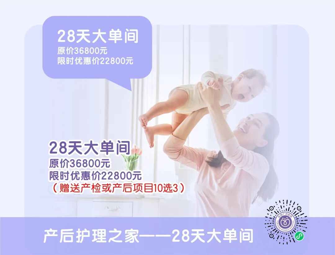 28天大单间:原价36800元,限时优惠价22800元,赠产检/产后项目10选3。