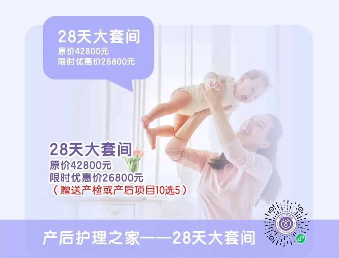 28天大套间:原价42800元,限时优惠价26800元,赠产检/产后项目10选5。